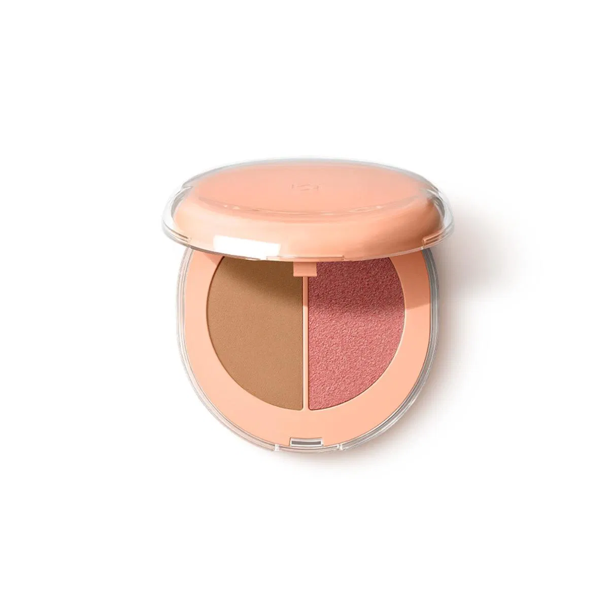 Blush duplo: pó mate e cremoso com acabamento brilhante.